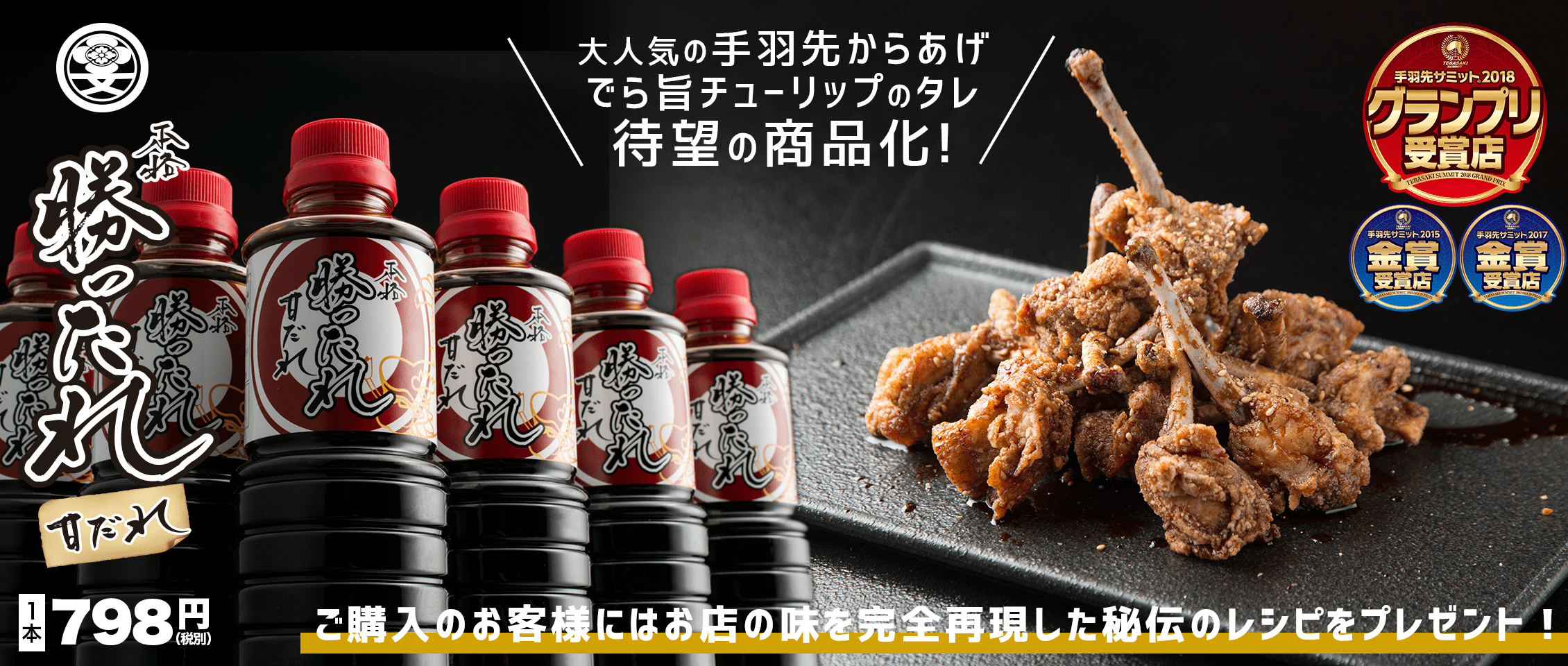 勝文商店大人気名物『でら旨チューリップ』の味となる甘辛醤油ダレ「勝ったれ」。お店でお出ししている味をご家庭でもお楽しみ頂きたいという思いと、とても万能であることから、是非オリジナルレシピをお客様に考案して頂き楽しんで使ってもらいたいという思いで誕生致しました。