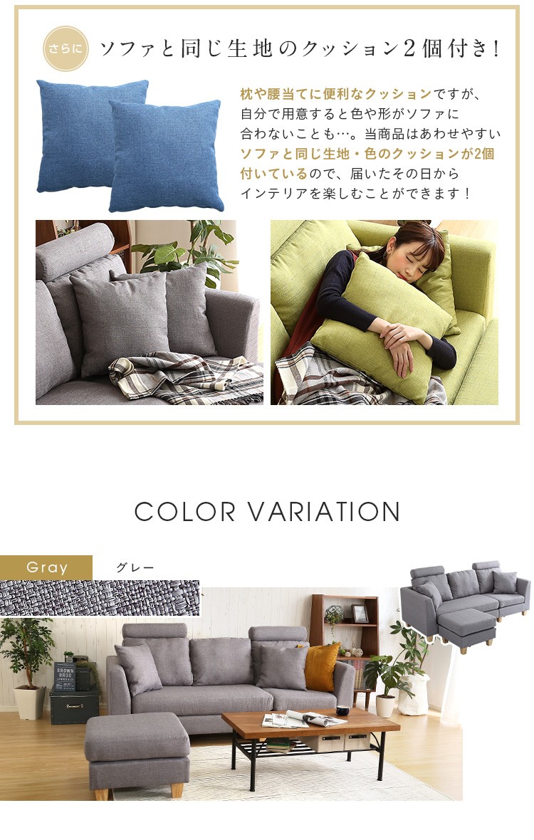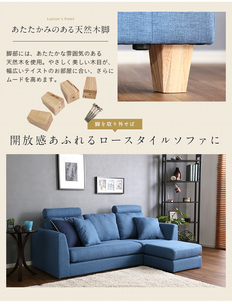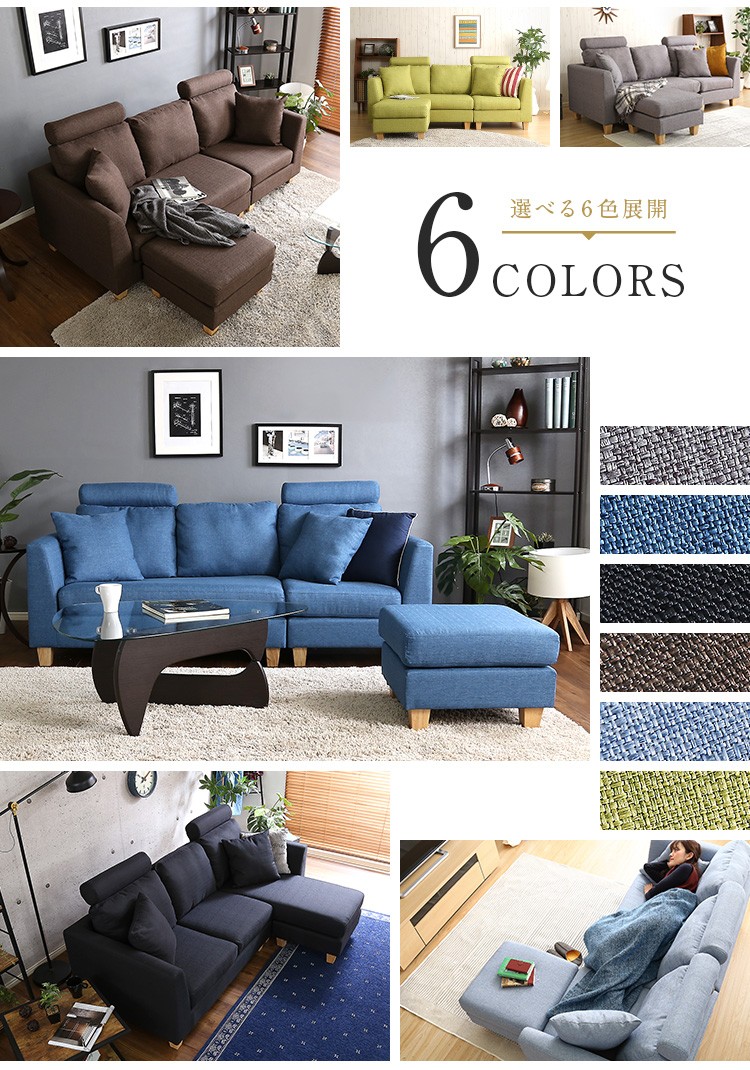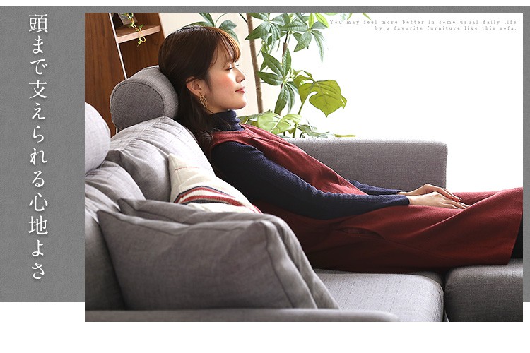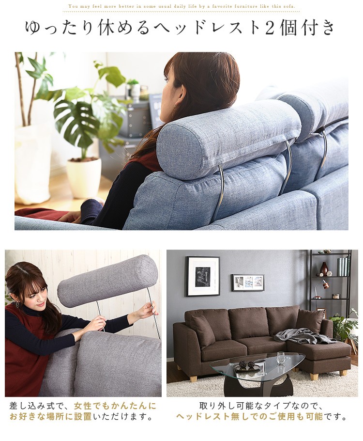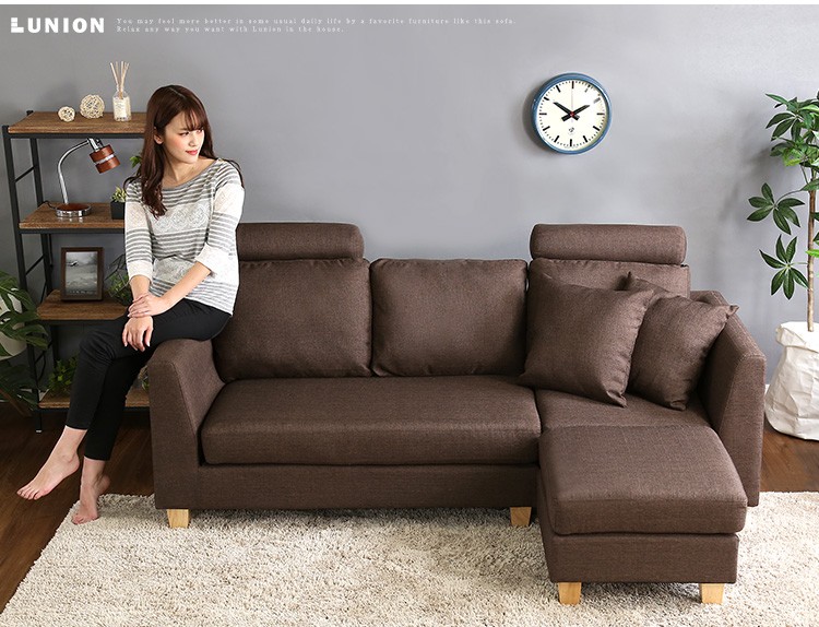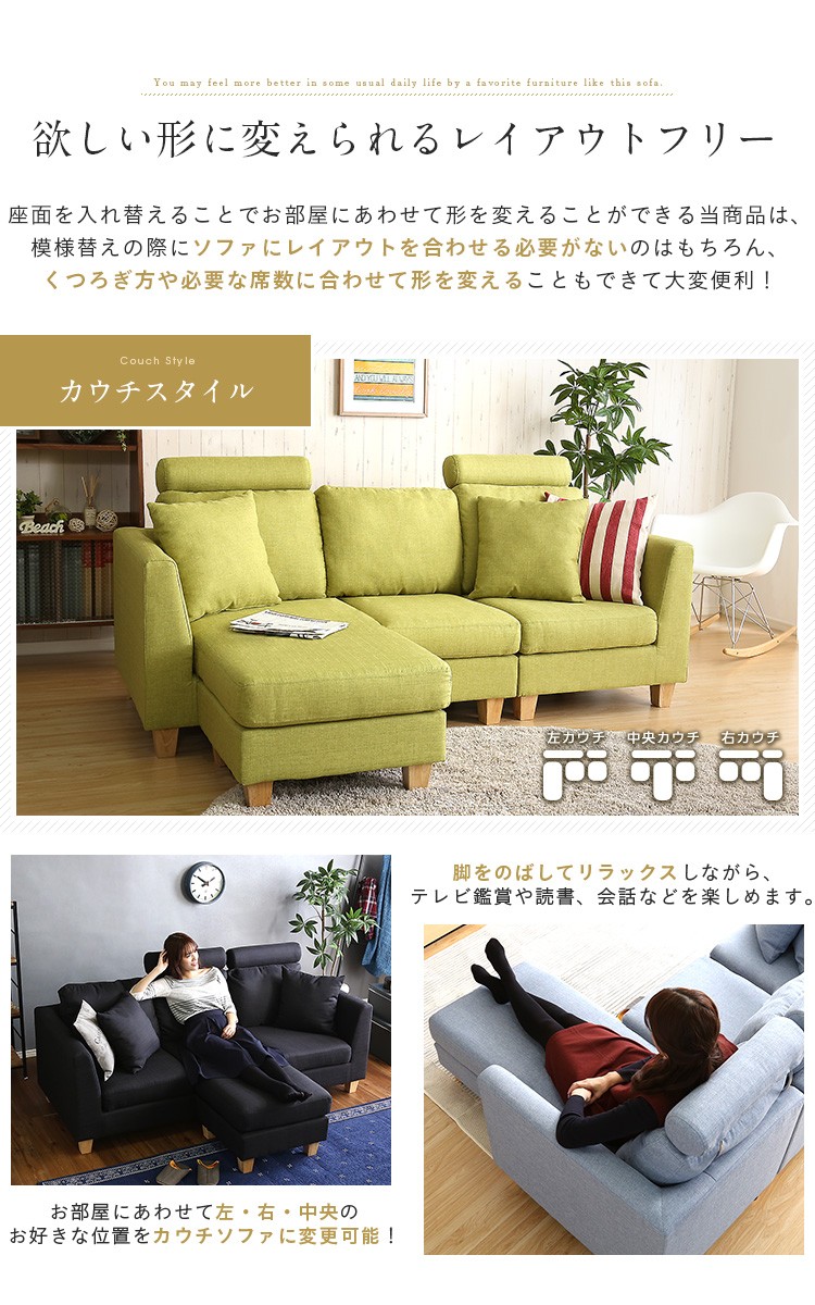 3人掛けカウチソファ(布地)6色展開 ヘッドレスト、クッション各2個付き|Lunion-ラニオン-