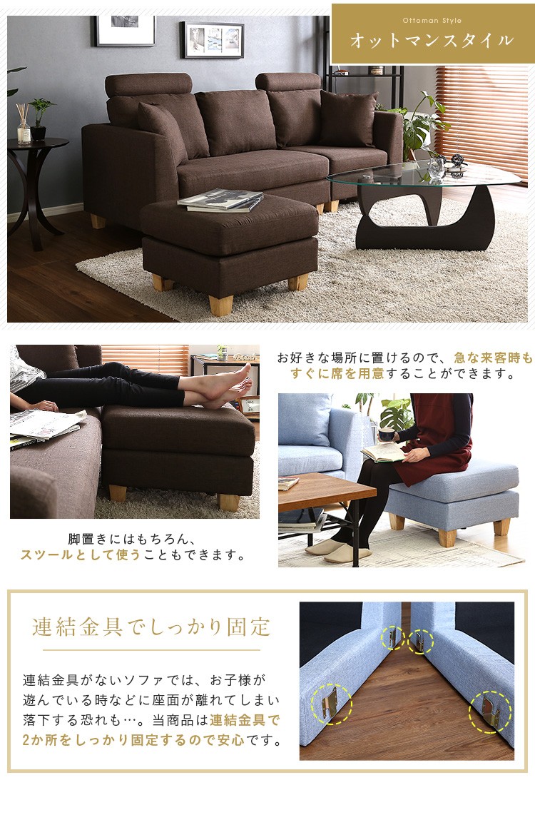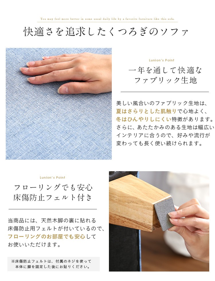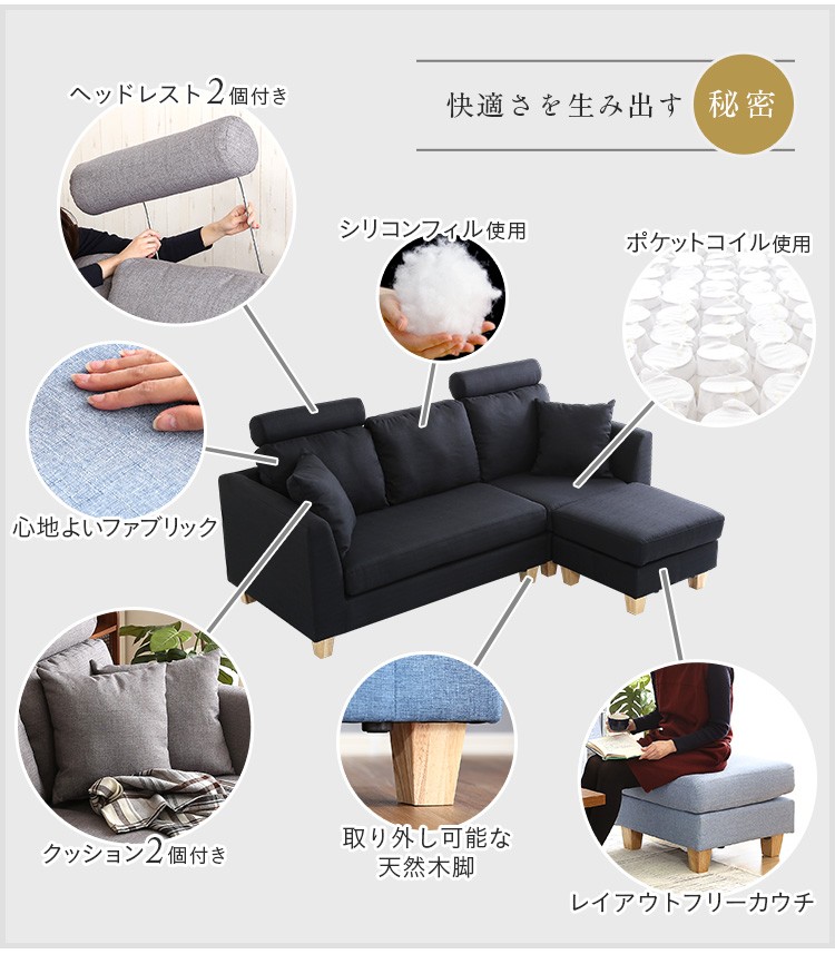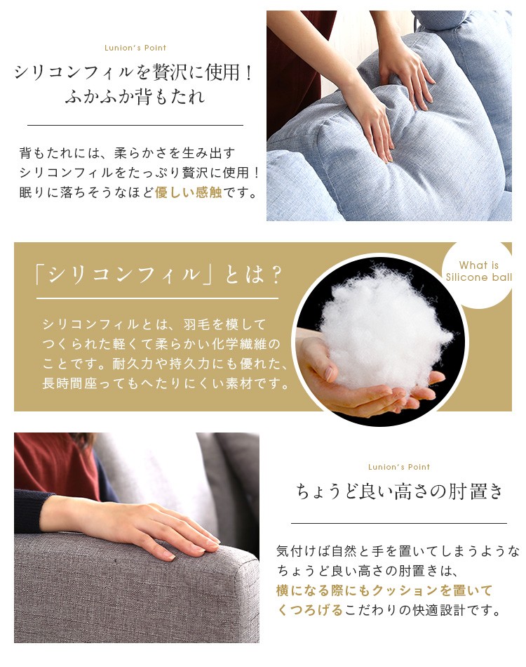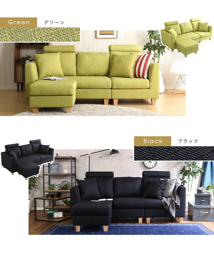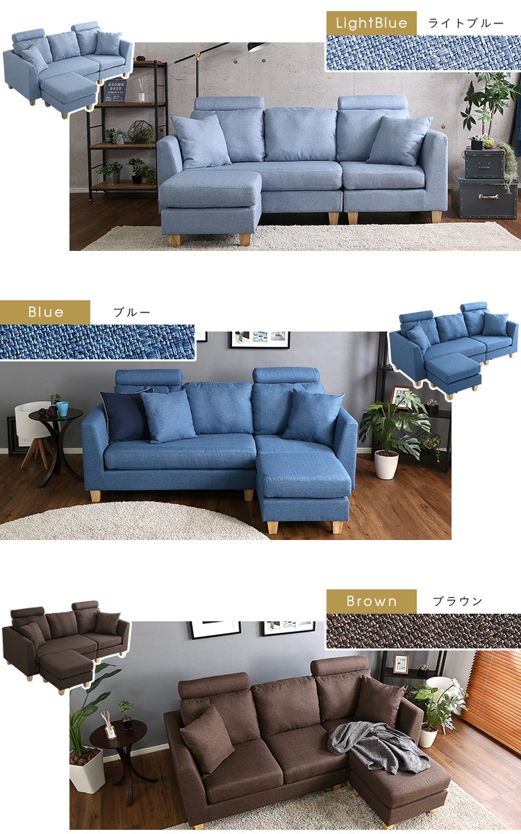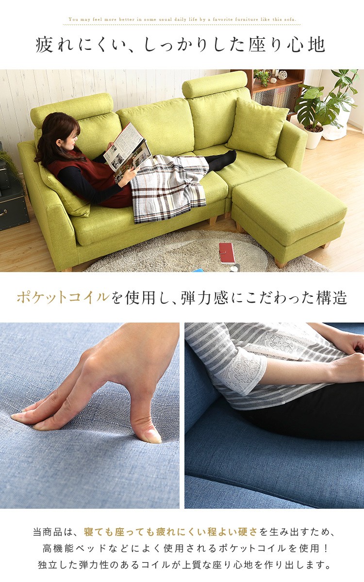 3人掛けカウチソファ(布地)6色展開 ヘッドレスト、クッション各2個付き|Lunion-ラニオン-