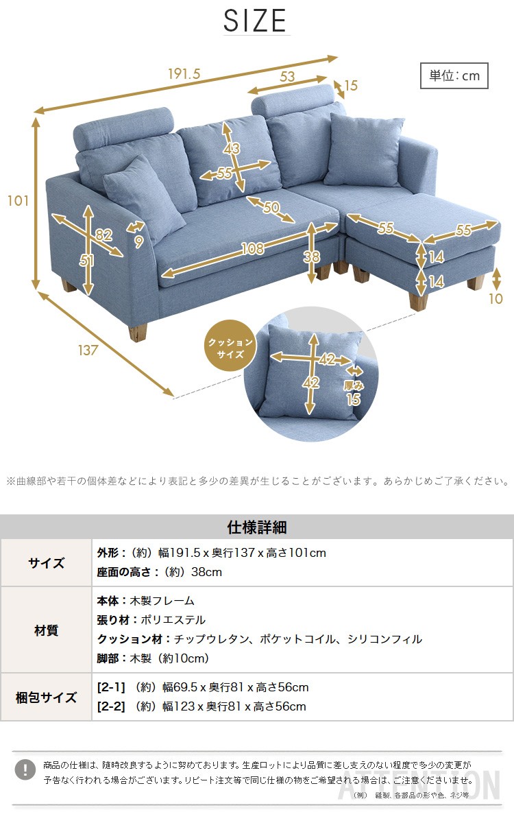 外寸:(約)幅191.5x奥行137x高さ101cm(座面の高さ 38cm)