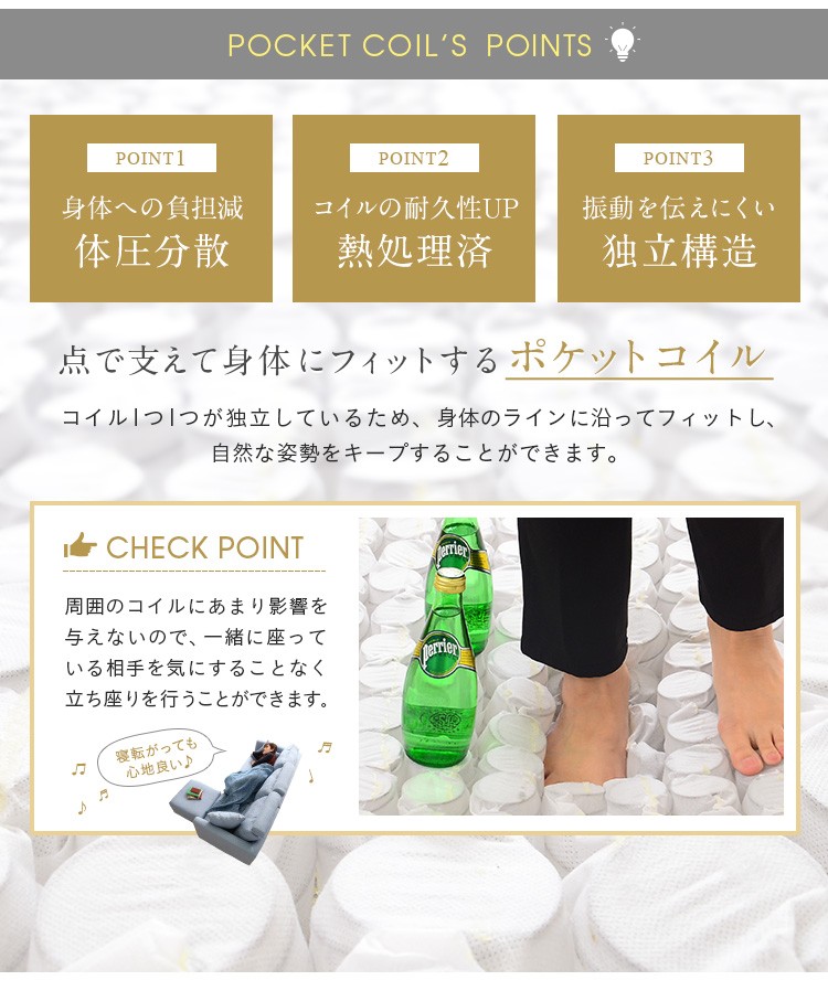 クッション材:チップウレタン、ポケットコイル、シリコンフィル