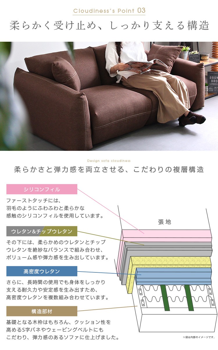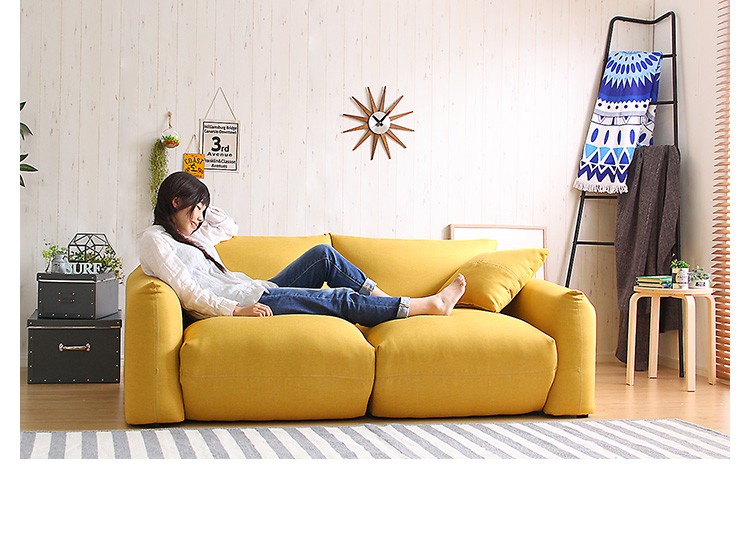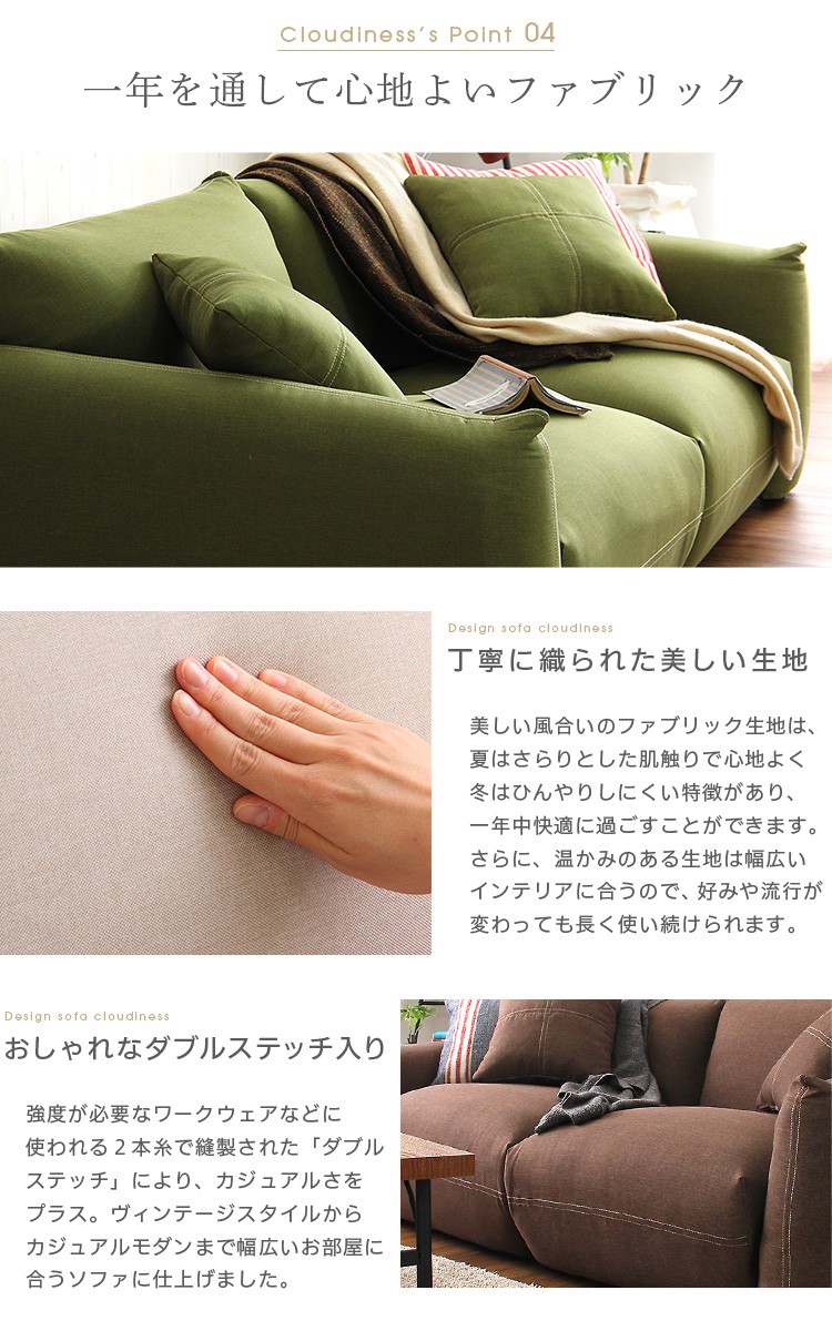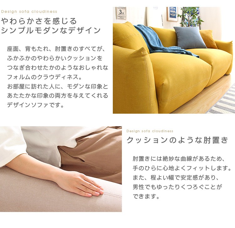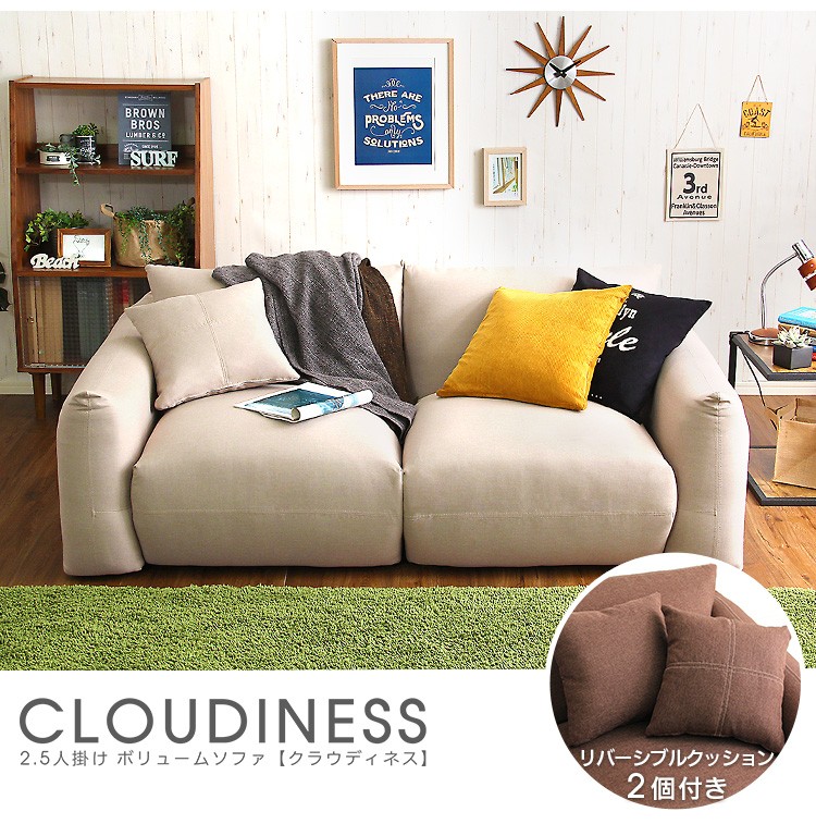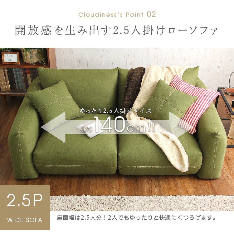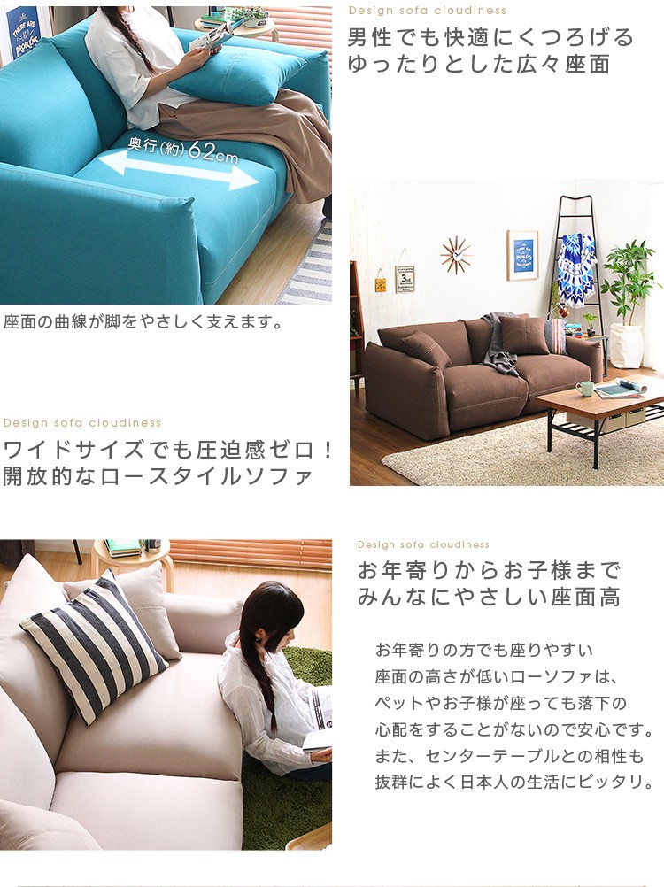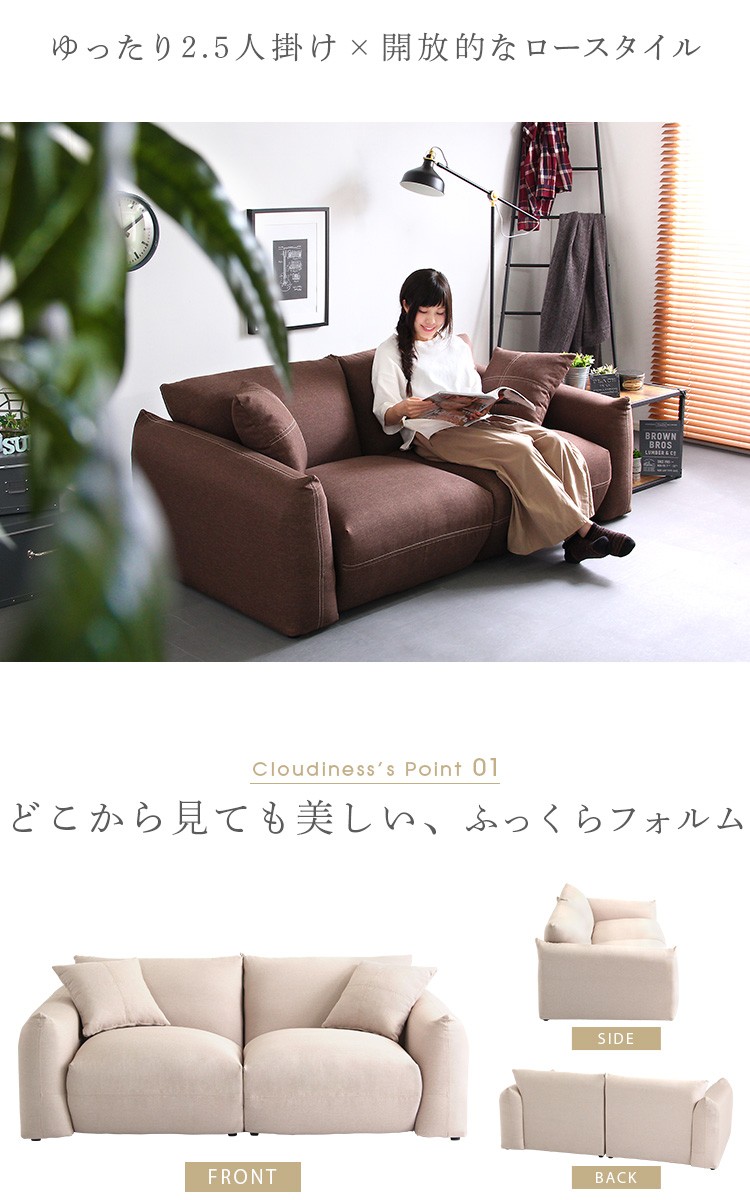 2.5人掛けデザインソファ(クッション2個付き) シンプルモダンローソファ 布地|Cloudiness-クラウディネス-