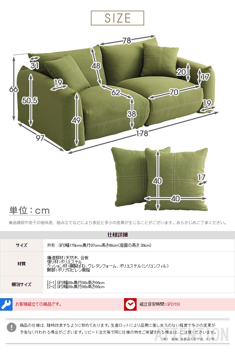 外寸:幅178cmx奥行97cmx高さ66cm(座面の高さ 38cm)