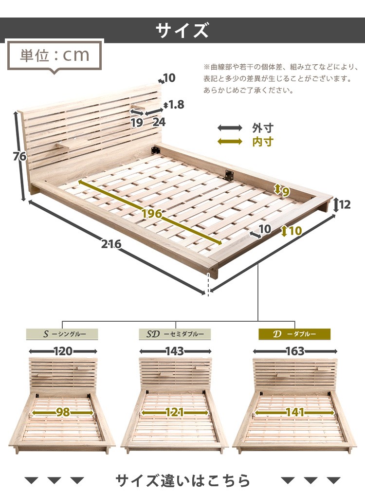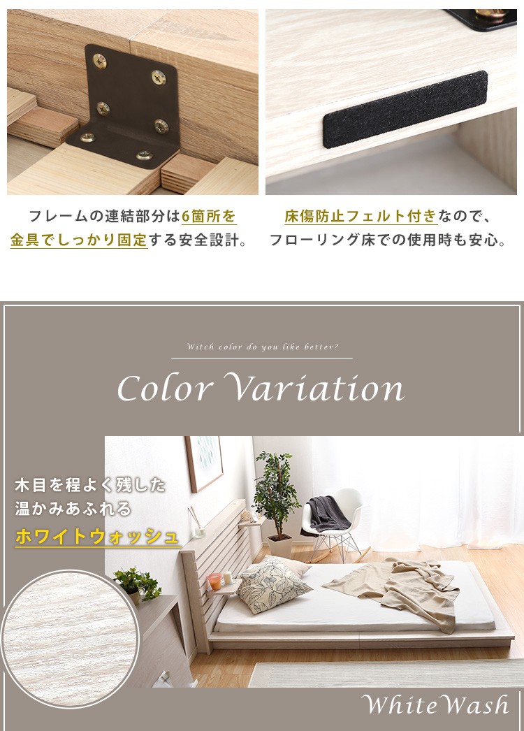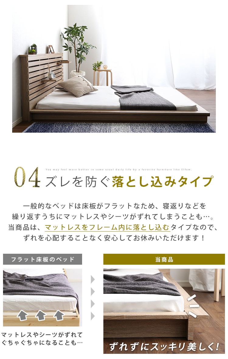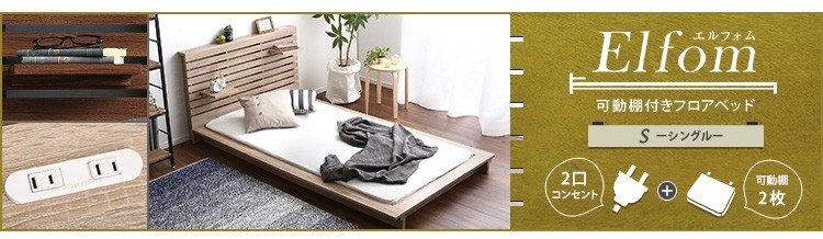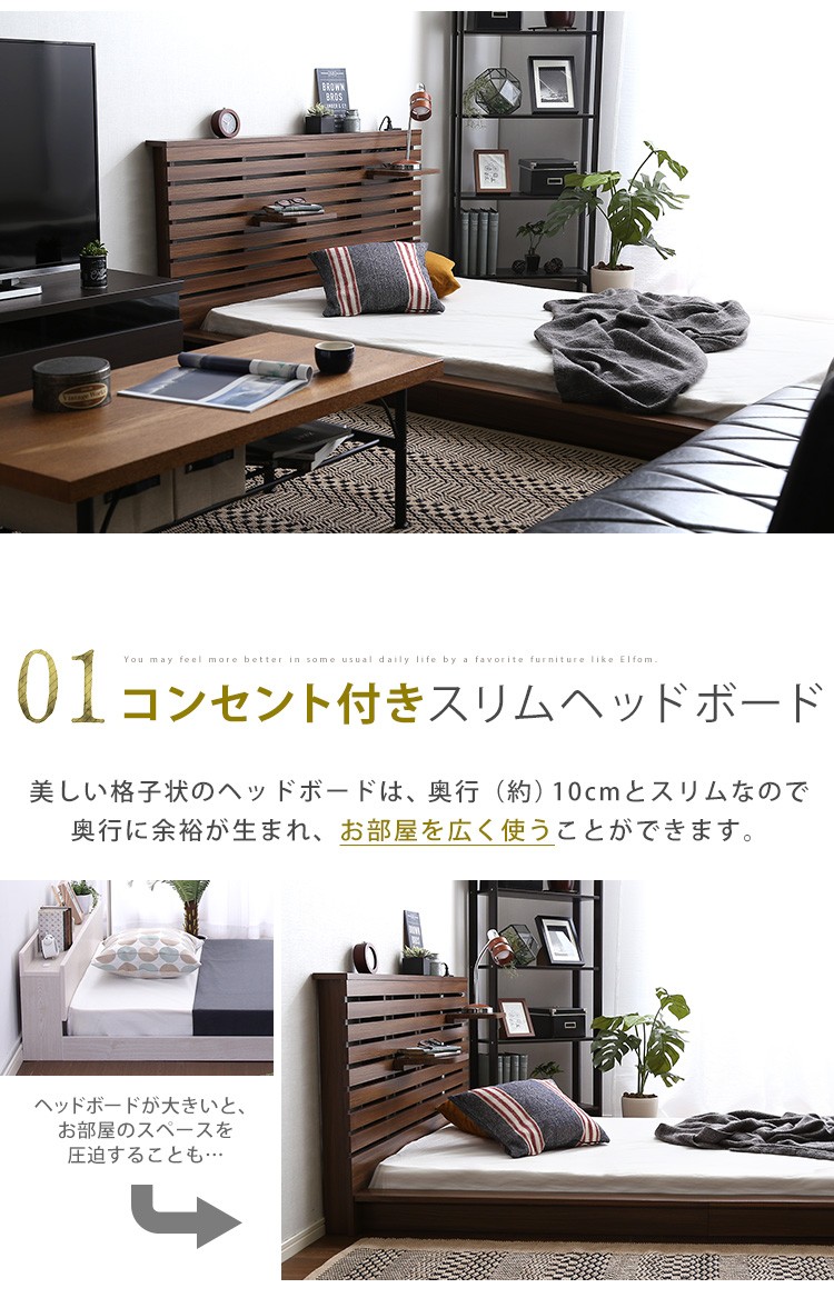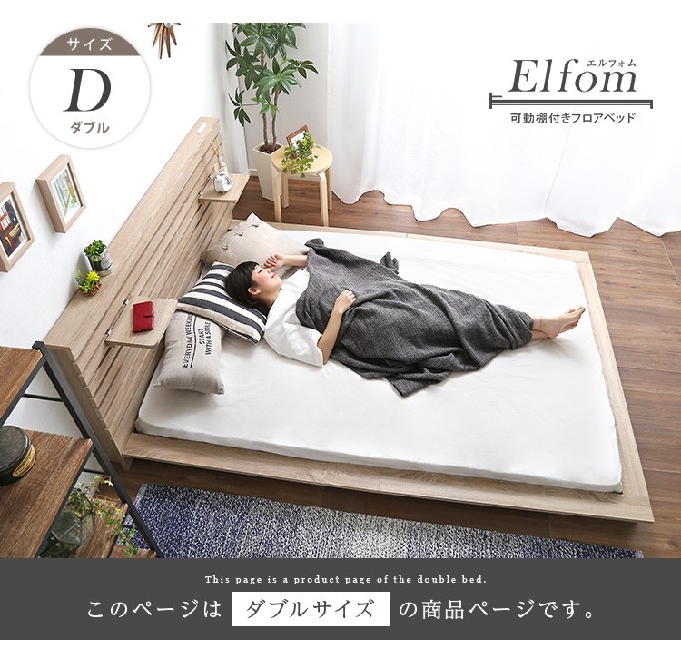 可動棚付きフロアベッド(ダブル)ベッドフレーム、ロースタイル、スリムヘッドボード|Elfom エルフォム
