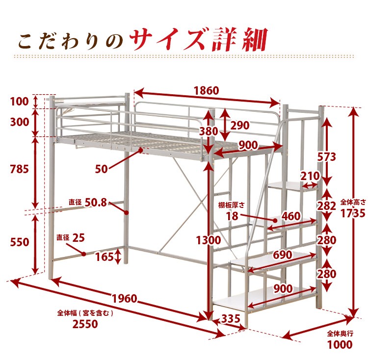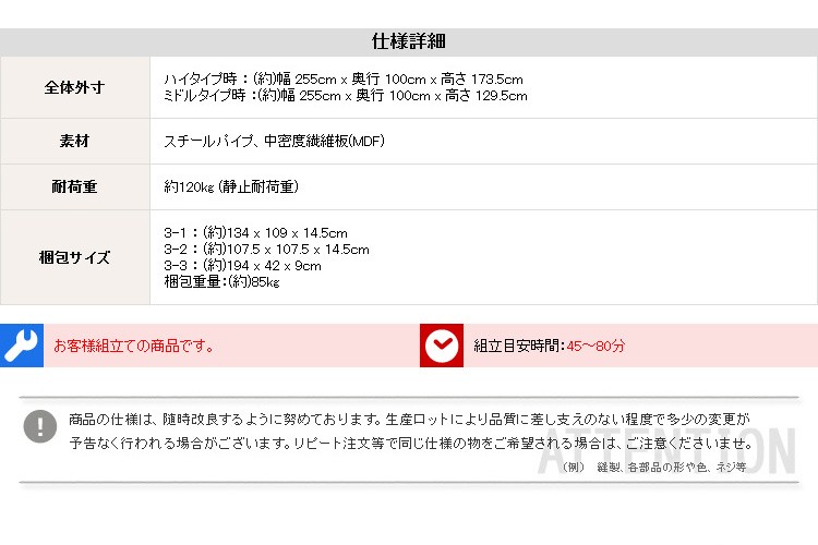 外寸:(約)ハイタイプ:幅255cmx奥行き100cmx高さ173.5cm