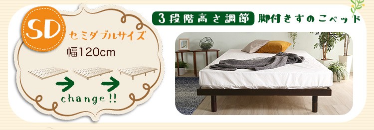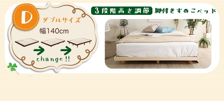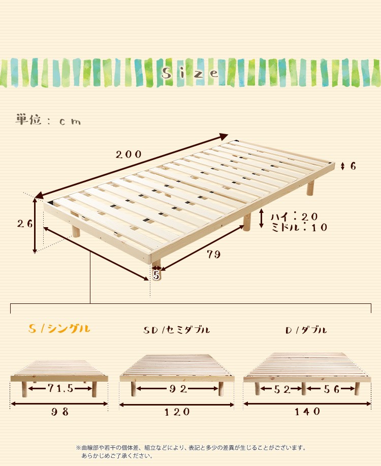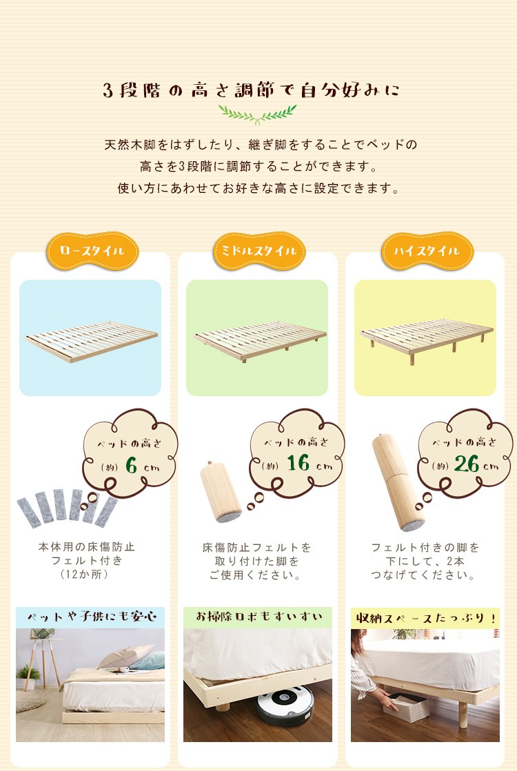 パイン材高さ3段階調整脚付きすのこベッド(シングル)