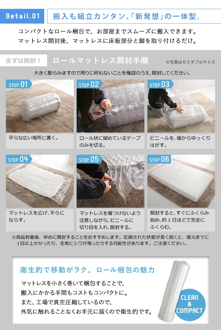 新発想で搬入も組立カンタン!やわらかな寝心地 脚付きロールマットレス(ポケットコイルスプリング)【Unite -Doux- -ユニテ・ドゥ-】ダブルサイズ