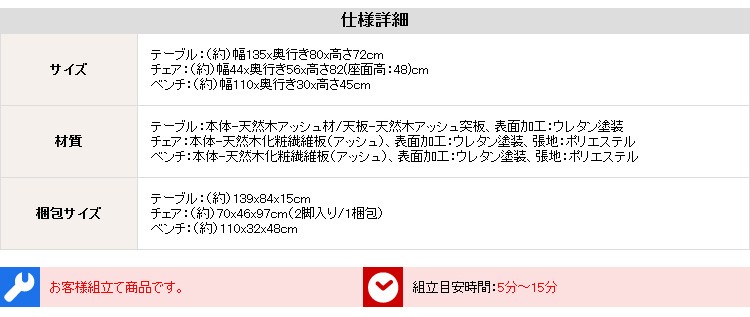 チェア/ベンチ本体:天然木化粧繊維板(アッシュ).ウレタン塗装.張地:ポリエステル