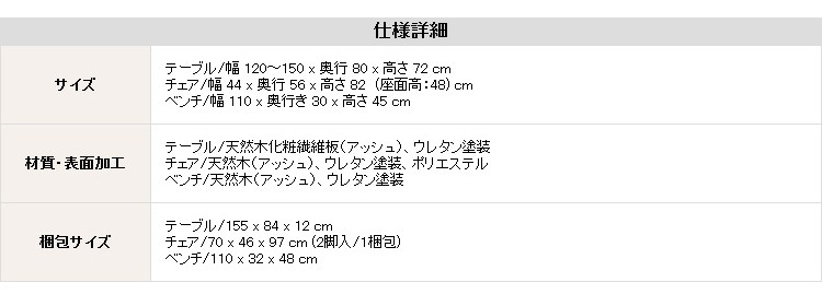 チェア:天然木化粧繊維板(アッシュ)、ウレタン塗装、ポリエステル