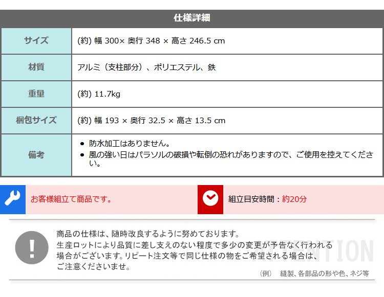 材質:アルミ(支柱部分)、ポリエステル、鉄 防水加工無し