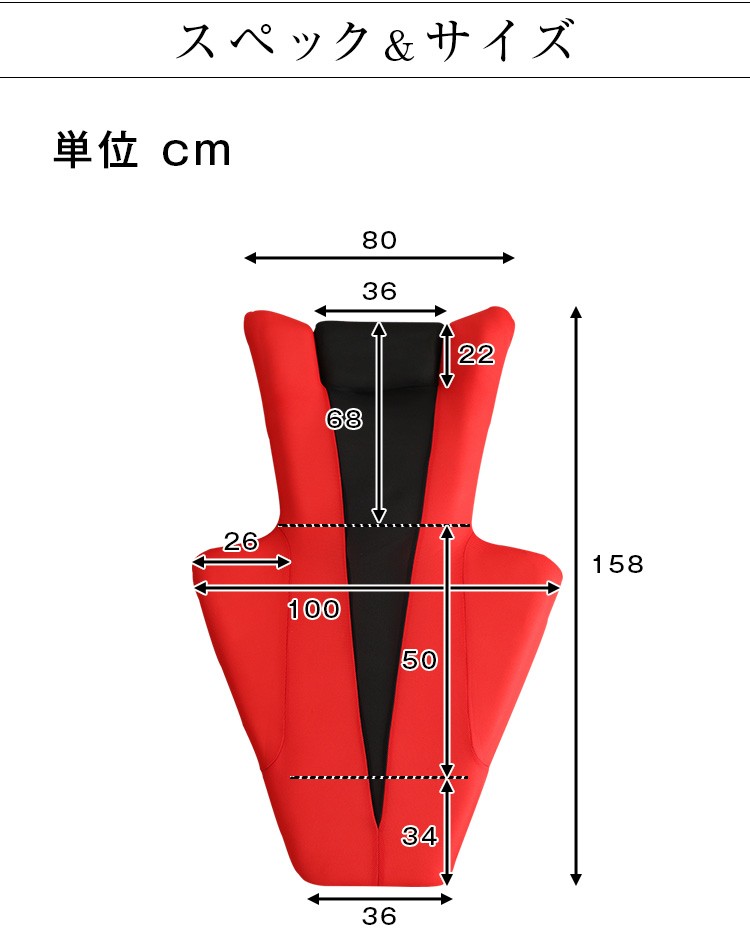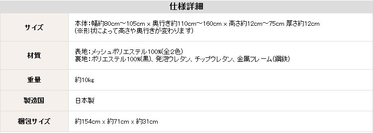 外寸:(約)幅80-100cm(座面幅約50cm)x奥行105-158cmx高さ13-70cm 厚さ:約13cm