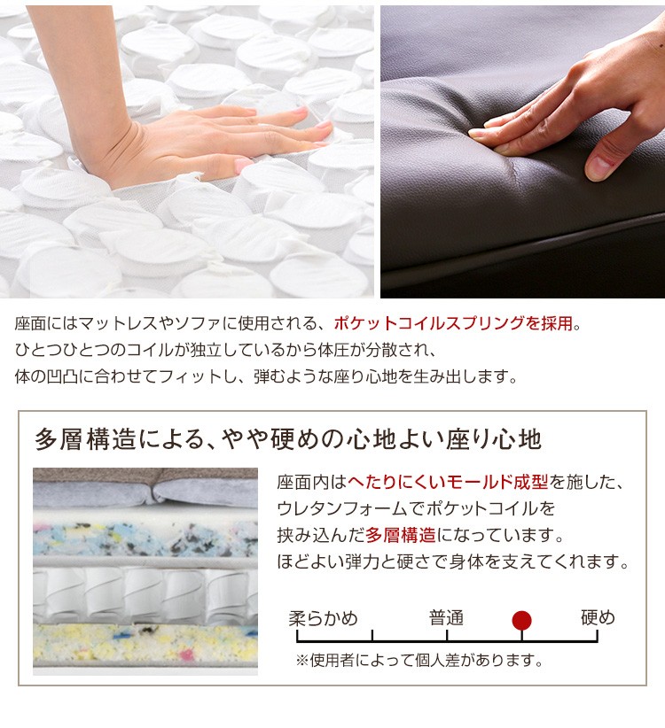 クッション材:ウレタン(モールド成型)、ポケットコイルスプリング