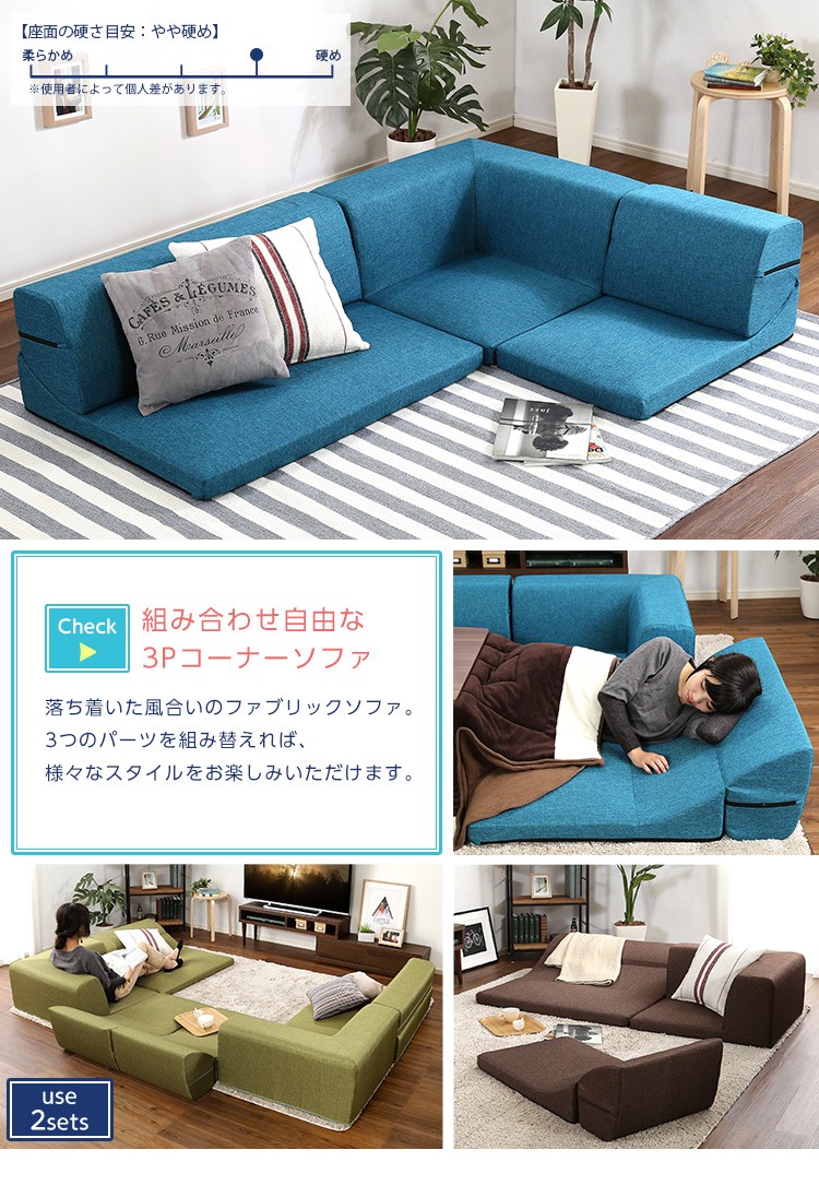コーナーフロアソファ ロータイプ ファプリック 3人掛け(5色)組み替え自由|Linaria-リナリア-
