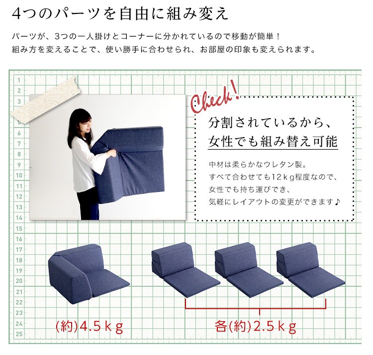 【商品重量】総重量:12kg(1人掛け:2.5kg、コーナー:4.5kg)