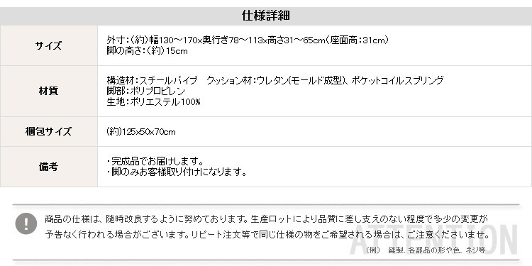 外寸:(約)幅130〜170x奥行き78〜113x高さ31〜65cm