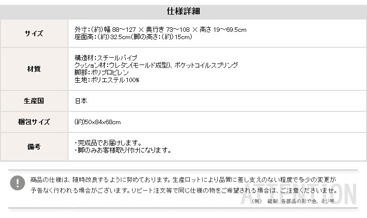 外寸:(約)幅 88〜127 × 奥行き 73〜108 × 高さ 19〜69.5cm