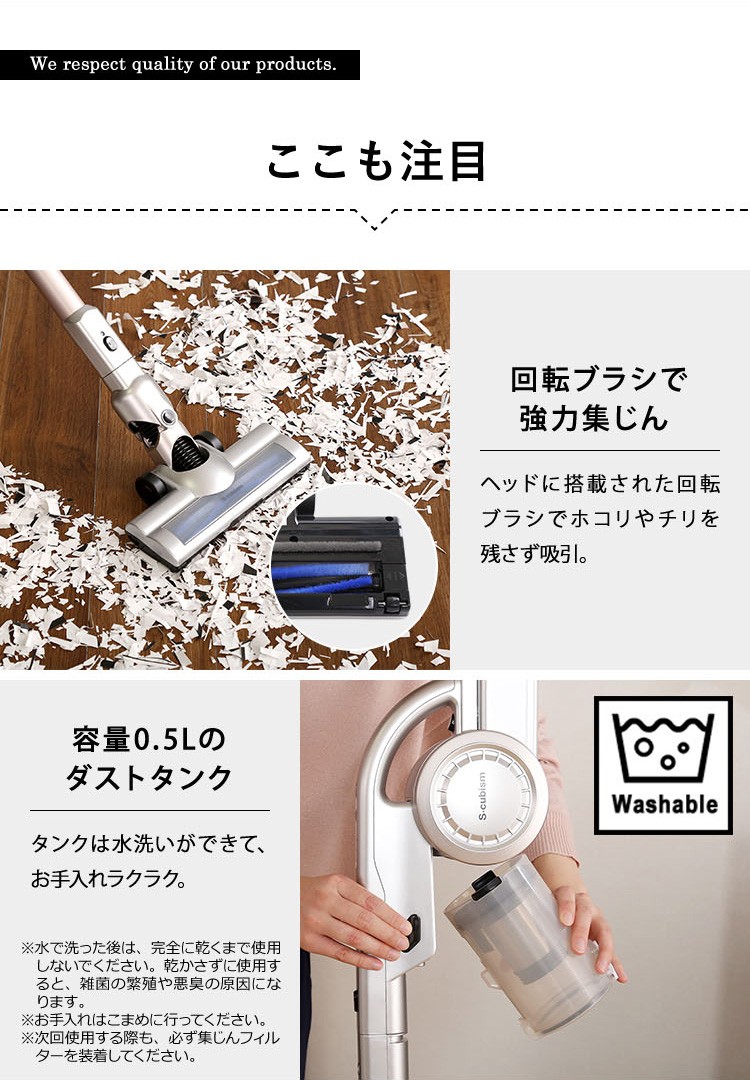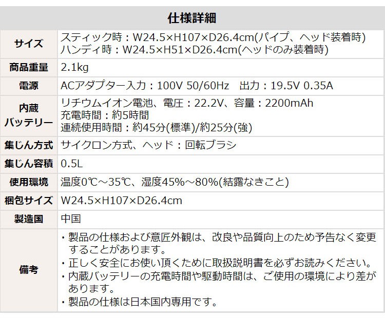 集じん方式:サイクロン方式、ヘッド;回転ブラシ