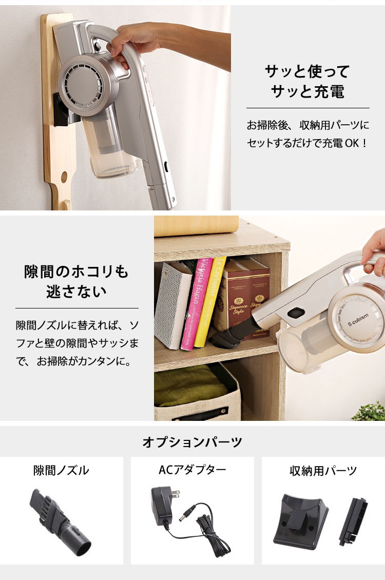 付属品:すき間ノズル、ACアダプター、収納用パーツ(ネジ2本含む)、取扱説明書(保証書付き)