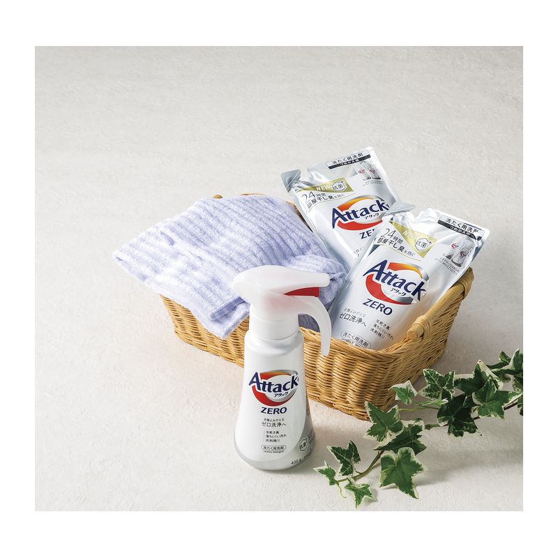片手で簡単ワンプッシュ、量の調整自由自在。花王アタックゼロ ワンハンドを中心に詰め合わせた洗剤ギフトセットです。落ちにくい汚れ0へ化学繊維を汚れが落ちやすい繊維に変えます。生乾き臭0へ。抗菌に加えてニオイ代謝を制御、気になる部屋干し臭を防ぎます。洗剤残り0へ余分な洗剤が残らない植物由来のバイオIOSを配合しました。手に持って、プッシュするだけ。誰でもかんたん計量。