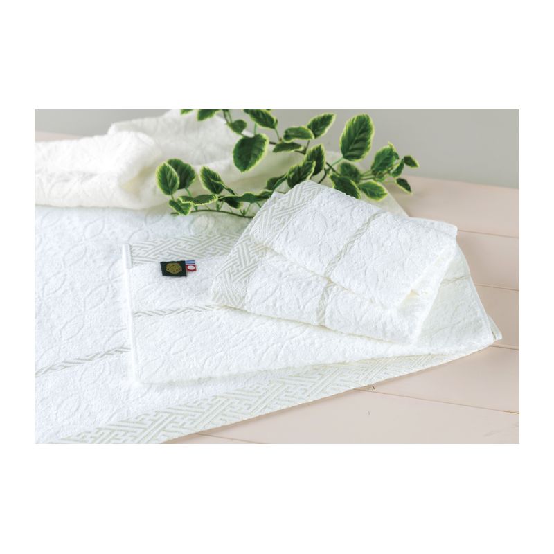 七宝柄をジャガードで表現し、白無垢で使用される紗綾形模様を光沢のある糸で縁に織り込みました。繊維長の長いフェルガナを使用したことでお洗濯後も柔らかく吸水性のあるタオルになっています。やわらかフェルガナの糸は中央アジアのフェルガナ盆地で栽培された綿花は枯葉剤を使用せず手摘みで収穫している為、不純物の少ない長綿が特徴です。