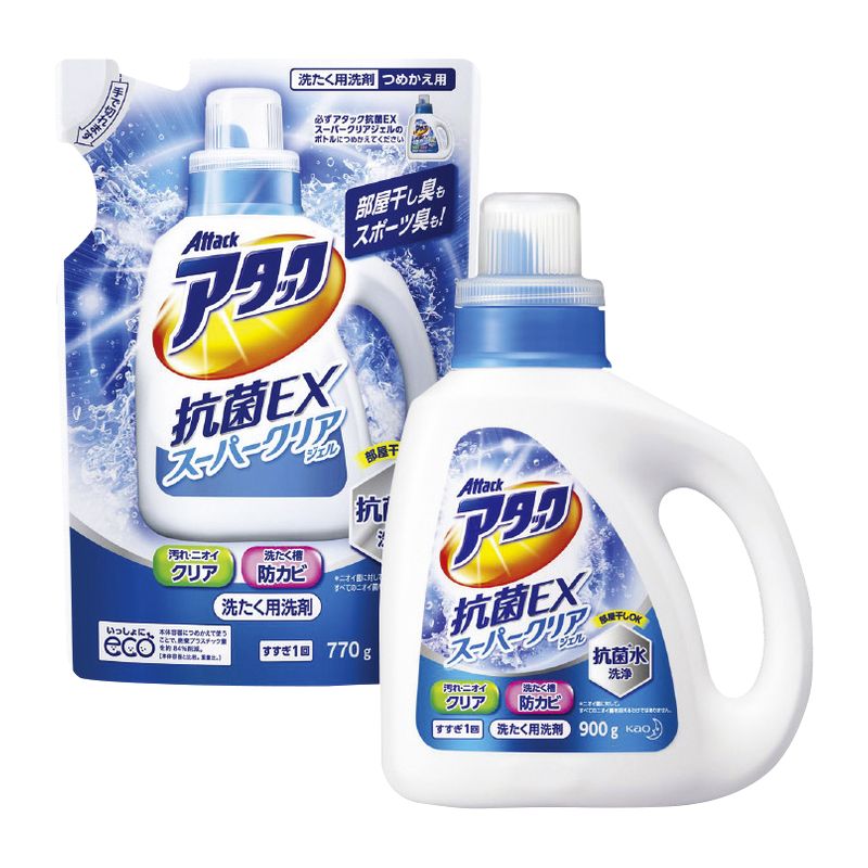 花王アタック抗菌EX スーパークリアジェル900g×1・詰替用770g×2、薬用ハンドソープ250mL×1・詰替用200mL×2・台所洗剤270mL×2