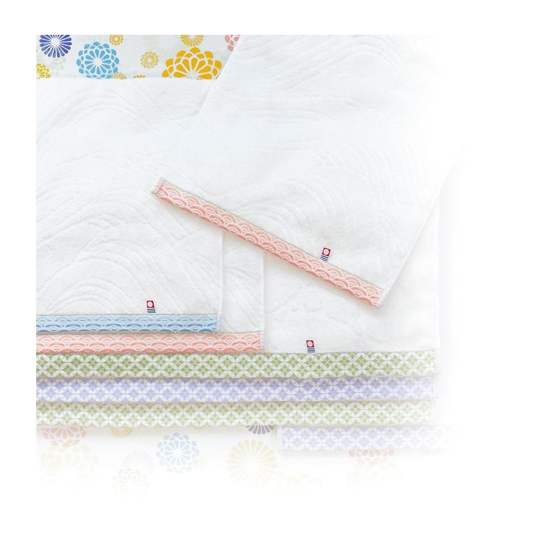 日本の伝統・小紋柄とラメのラインでさりげなく彩られたシンプルなタオル。一見、白無地に見える面にも模様が施されています。