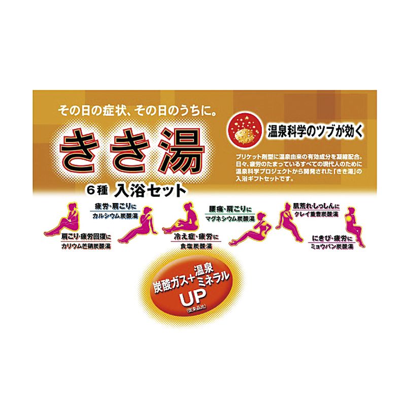温泉ミネラル+炭酸ガスの温浴効果で、 1日の終わりにからだケア。 翌日の症状を和らげる新・入浴習慣「きき湯」。 温泉科学プロジェクトから開発された 「きき湯」の入浴ギフトセットです。