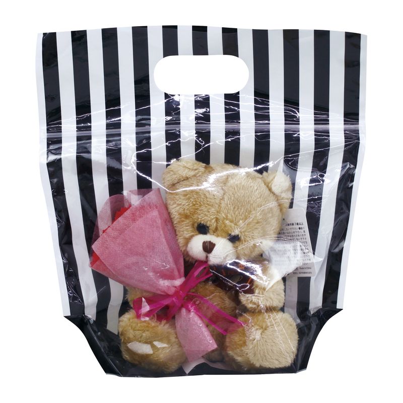 プリザーブドフラワーの花束を持ったベアぬいぐるみ。袋部分がジッパーになっており、他のものを入れることが出来ます。※花材が変更になる場合があります。