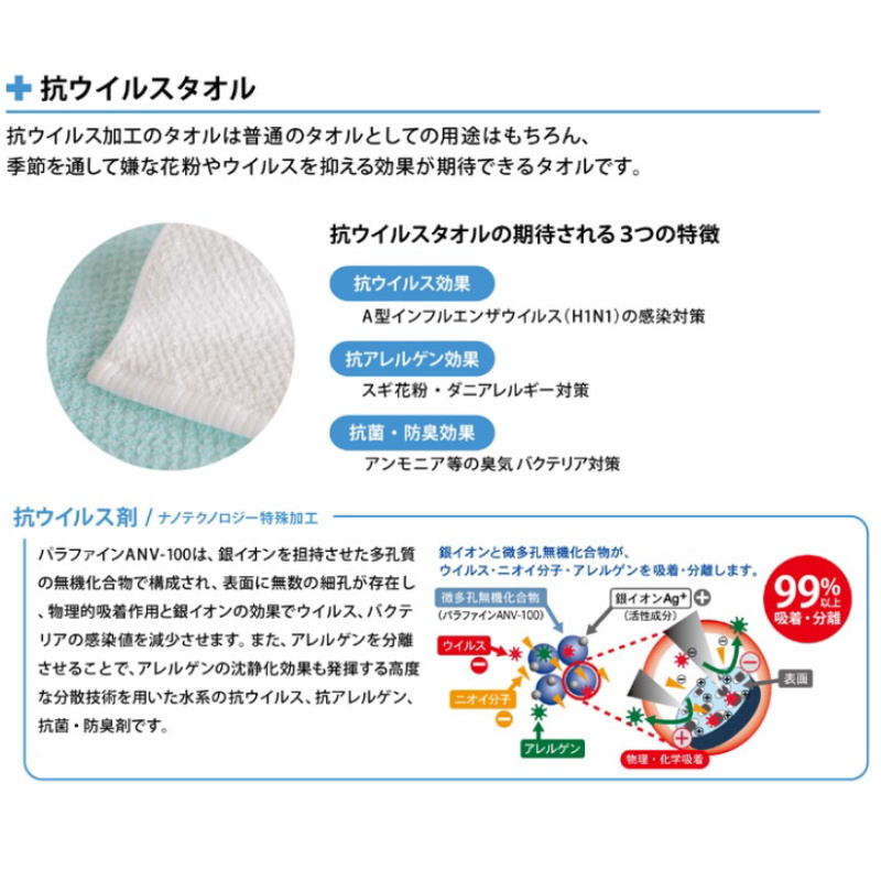 抗ウイルス加工…抗ウイルス加工のタオルは普通のタオルとしての用途はもちろん、季節を通して嫌な花粉やウイルスを抑える効果が期待できるタオルです。【期待される3つの効果】1.A型インフルエンザウイルス(H1N1)の感染対策 2.アンモニア等の臭気バクテリア対策 3.スギ花粉、ダニアレルギー対策
