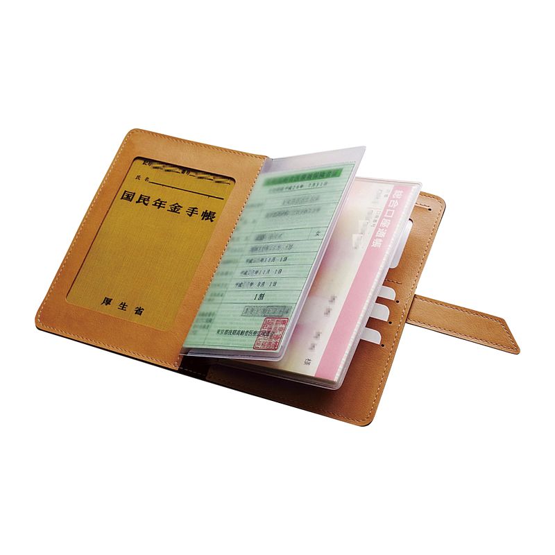 後期高齢者証、年金手帳、健康保険証、各種カードなど全て保管可能。台紙を変更し通帳ケースとしても対応可能です。ブラック、ブラウン共に内側はキャメル色となります。