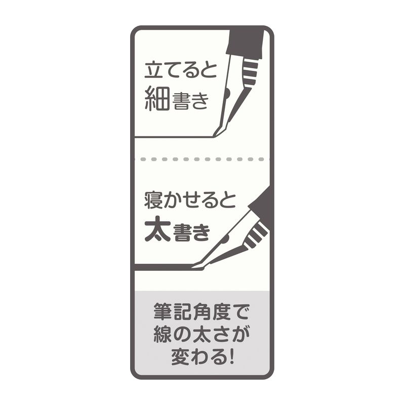 筆の扱いが苦手な方でも、特殊なペン先によって簡単に筆文字が書ける万年筆です。ペン先を立てるとより細字に、ペン先を寝かせるとより太字に、筆記角度により文字の太さを自由に変える事が出来ます。「若竹(ペン先角度55度)」はペン先を立てて書く方に。「紺(ペン先角度40度)」はペンを寝かせて書く方に。