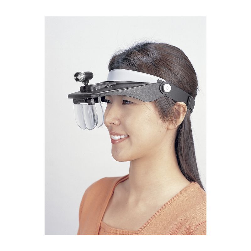 LEDライトが付いているサンバイザー型のルーペです。両手を使うことができるので、作業が楽にできます。細かい手先の作業にはとっても便利。頭に合わせてベルトで調整可能。上下左右に角度を微調整可能。 ・各レンズ倍率:×1.2・×1.8・×2.5・×3.5