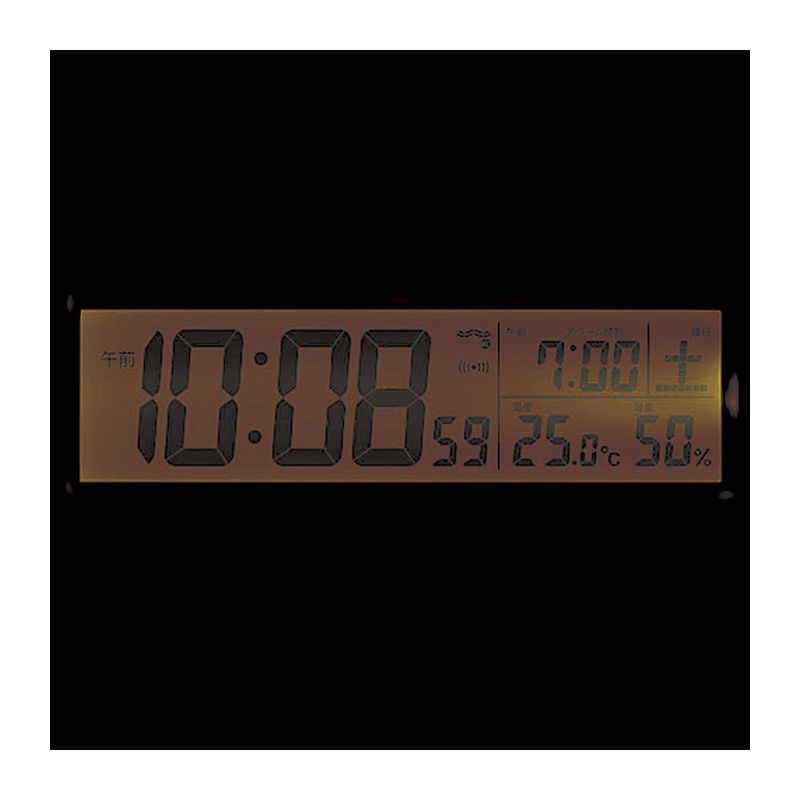 アラームONでライトが光り続ける電波目覚まし時計●電波受信OFF ●温度、湿度表示●フルオートカレンダー ●電子音アラーム ●スヌーズ●アラームONでライトが常時点灯 ●角度調整
