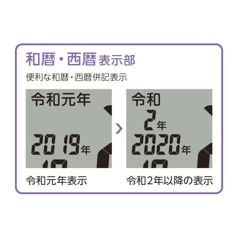 元号と西暦を併記で表示する電波時計 ●電波受信OFF ●フルオートカレンダー ●電子音アラーム ●西暦・和暦併記 ●スヌーズ ●六曜表示 ●温度・湿度表示 ●アラームモニター ●12/24時間制切替式 ●掛置兼用