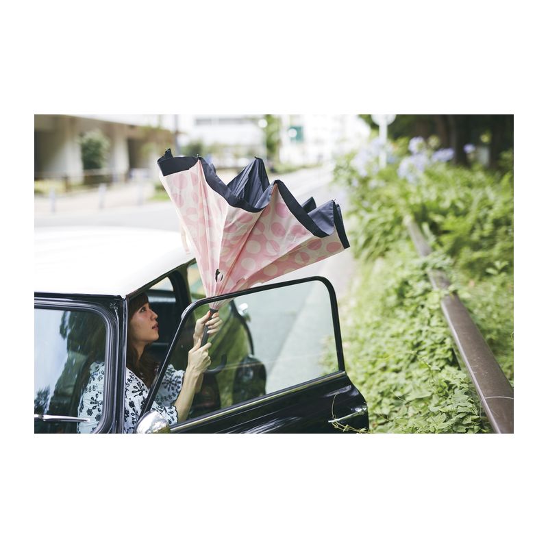 雨に濡れた面を内側に閉じる特殊な2重構造で水滴に触れずに使える傘 花のつぼみのように逆さに開くので、車の乗り降り時にスムーズに傘の開閉が出来ます。 また濡れた傘でシートがビショビショになる問題も、濡れた面が内側になることで解決してくれます。 電車で周りや自分が濡れないように気を遣うこともなく雨の日のストレスを軽減してくれます。 ベルトをしていない状態だと自立するのでチョイ置き出来て便利です。 2重構造のおかげでホネが露出していないので髪の毛が挟まる心配もありません。
