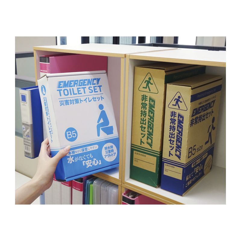 コンパクトに備蓄可能なトイレ処理キット。B5ファイルボックスサイズで棚や引き出しに常備しやすい。停電時の発光棒、目隠しのポンチョもセット。排泄後、凝固剤を振りかけ固めて可燃ごみとして廃棄できます。※皮膚刺激性試験、経口性試験済。凝固剤は10年保存可能。