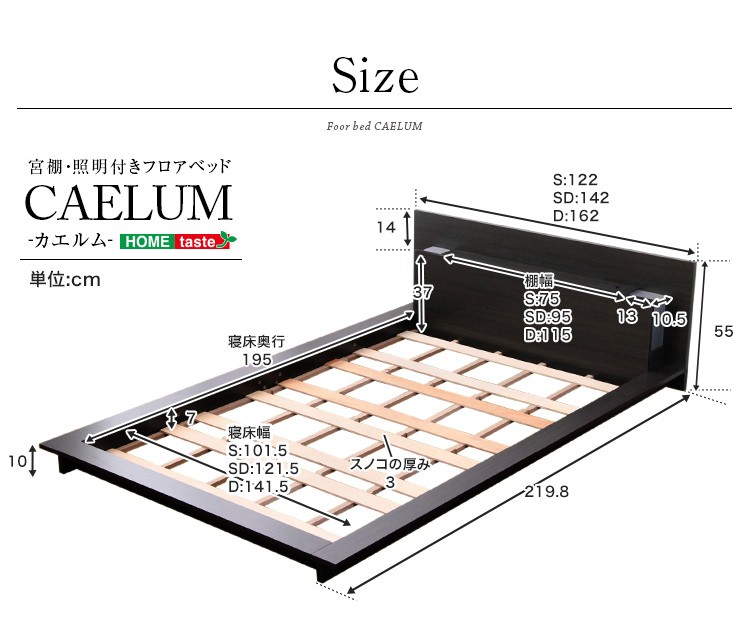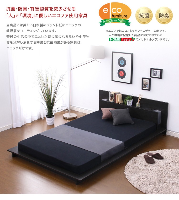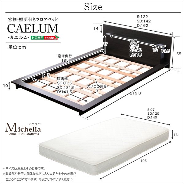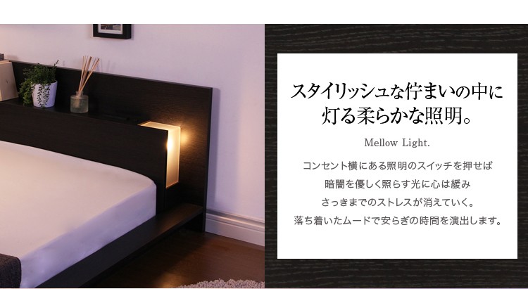 宮、照明、コンセント付きフロアベッド【カエルム-CAELUM-(シングル)】(ロール梱包のボンネルコイルマットレス付き)