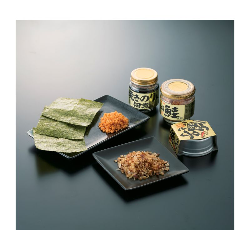 有明海産の味付け海苔、風味豊かな鰹節、小豆島で製造された焼海苔の佃煮、北海道産鮭フレークの詰合せです。お弁当や普段の食卓に華を添える逸品です。