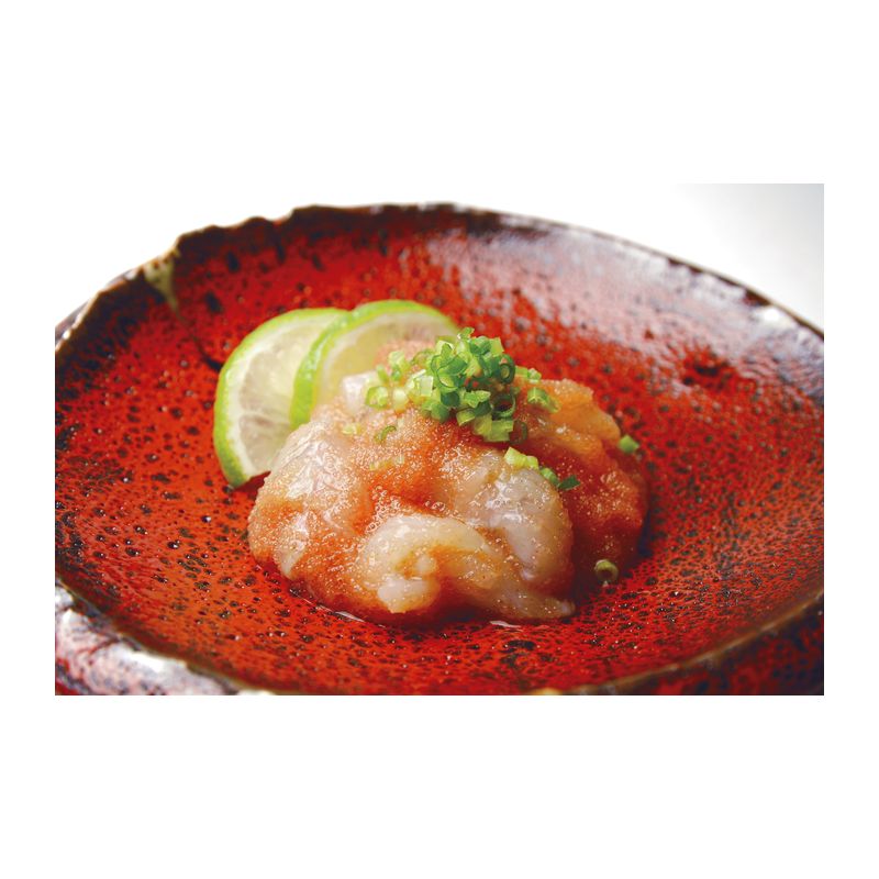 紅の「ふく明太子和え」は明太子の辛味と身皮の歯応えがクセになる美味しさ。白の「ふく白子ポン酢ゆず胡椒」は濃厚な白子とゆず胡椒のきいたポン酢ジュレがベストマッチ!