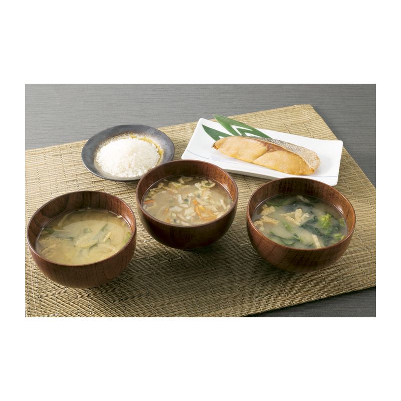 新潟県産こしひかり150g×3、北海道産焼鮭切身40g×4、具材を味わうおみそ汁×6(長ねぎ7.8g、ほうれん草6.2g、豚汁9.8g×各2)、たまごスープ6.4g×2