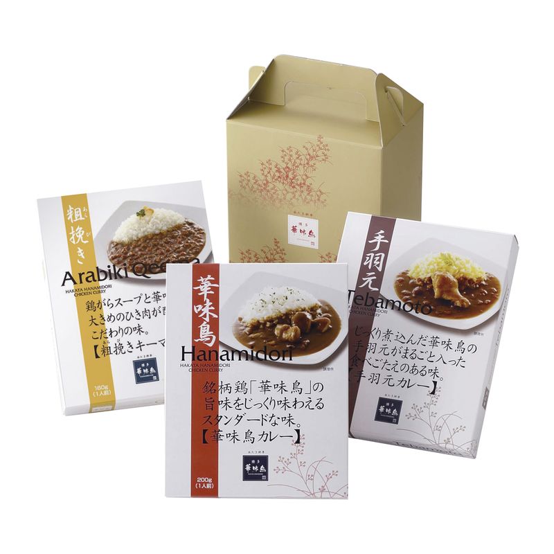 九州産・銘柄鶏「華味鳥」を使用し、水たき料亭「博多華味鳥」総料理長が監修したチキンカレーのセットです。華味鳥のもも肉をたっぷりと加え、もも肉のジューシーさを最大限に活かした「華味鳥カレー」、華味鳥の手羽元を丸ごと1本使用し、じっくり煮込んだ「手羽元カレー」、華味鳥の挽き肉をたっぷり使用したボリュームのある「キーマカレー」の3種類をセットに致しました。自慢の「水たきスープ(鶏がらスープ)」を隠し味に加えることによって、コクのある味わいに仕上げております。
