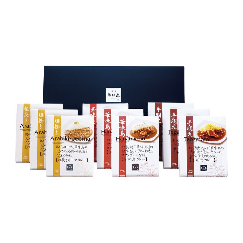 九州産・銘柄鶏「華味鳥」を使用し、水たき料亭「博多華味鳥」総料理長が監修したチキンカレーのセットです。華味鳥のもも肉をたっぷりと加え、もも肉のジューシーさを最大限に活かした「華味鳥カレー」、華味鳥の手羽元を丸ごと1本使用し、じっくり煮込んだ「手羽元カレー」、華味鳥の挽き肉をたっぷり使用したボリュームのある「キーマカレー」の3種類をセットに致しました。自慢の「水たきスープ(鶏がらスープ)」を隠し味に加えることによって、コクのある味わいに仕上げております。