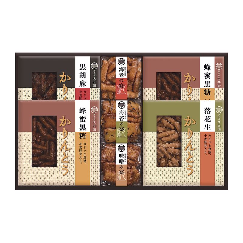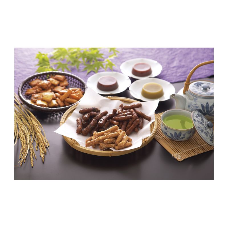 蜂蜜・黒糖の程良い甘さの蜂蜜黒糖かりんとう、香ばしい落花生をまぶした落花生かりんとうに、喉ごしにこだわった抹茶・練り・小倉の3種の味の羊かん、あられ各種など日本のおやつの詰合せです。