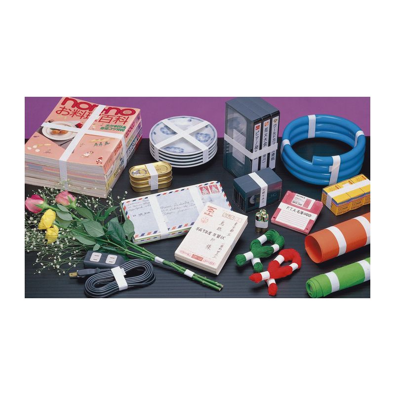 テープ同士のみが接着する自着性テープ・簡単に剥がすことができ、剥がしても結束物に糊が付着しません。(数回程度の再使用も可)・水に強いテープです。 ・テープ表面に筆記することができます。