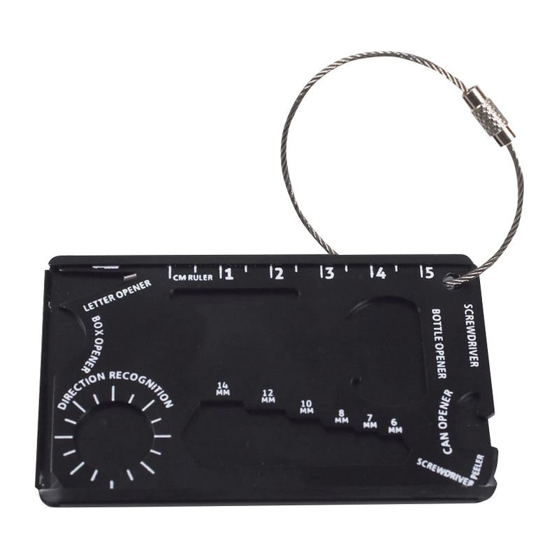 薄くて、頑丈なアルミケース付きの便利な14機能の万能ツール!1.ボックスオープナー 2.レターオープナー 3.ルーラー(5cm) 4.蝶ねじレンチ 5.栓抜き 6.キーチェーンホール 7〜10.ドライバー(4種類) 11.缶切り 12.フルーツピーラー 13.六角レンチ(6サイズ)14.角度ゲージ