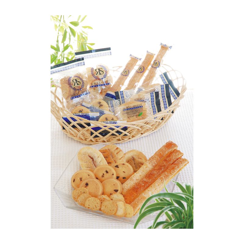 ロングスティックパイ×3、ミニラスク20g×2(プレーン・キャラメル×各1)、チョコチップクッキー×10、リーフパイ×4