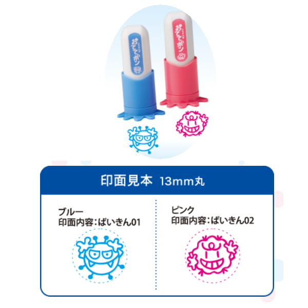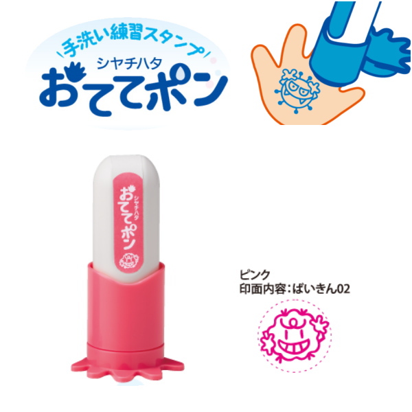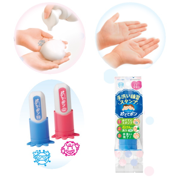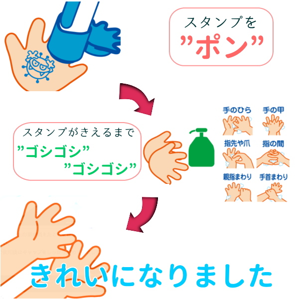 手のひらにスタンプした印影を市販の石けんでしっかり洗い落とすことで、楽しみながら手洗いの練習ができます。