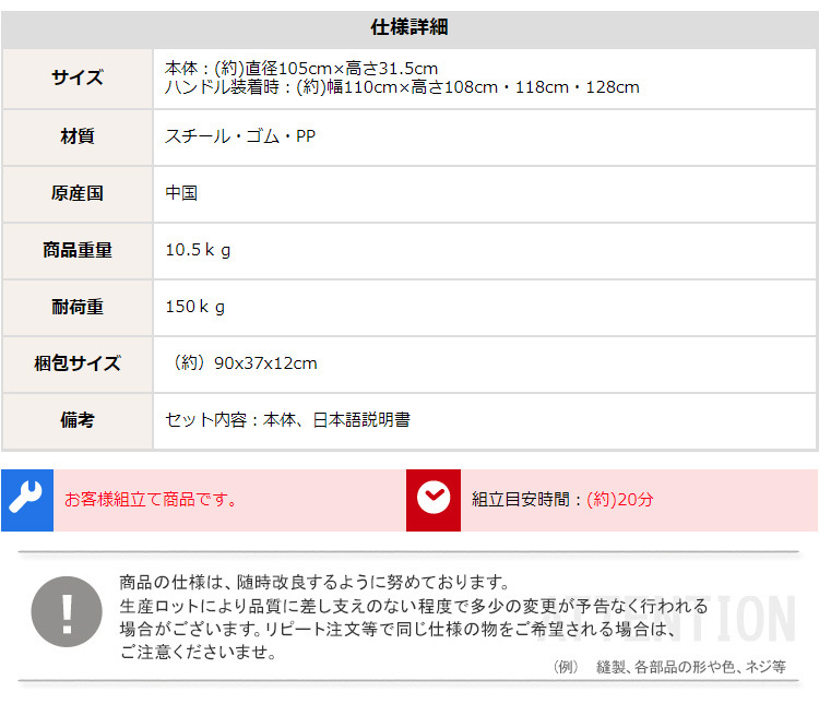 直径101×高さ31.5cm(ハンドル高さ3段階調節:約108cm、118cm、128cm)