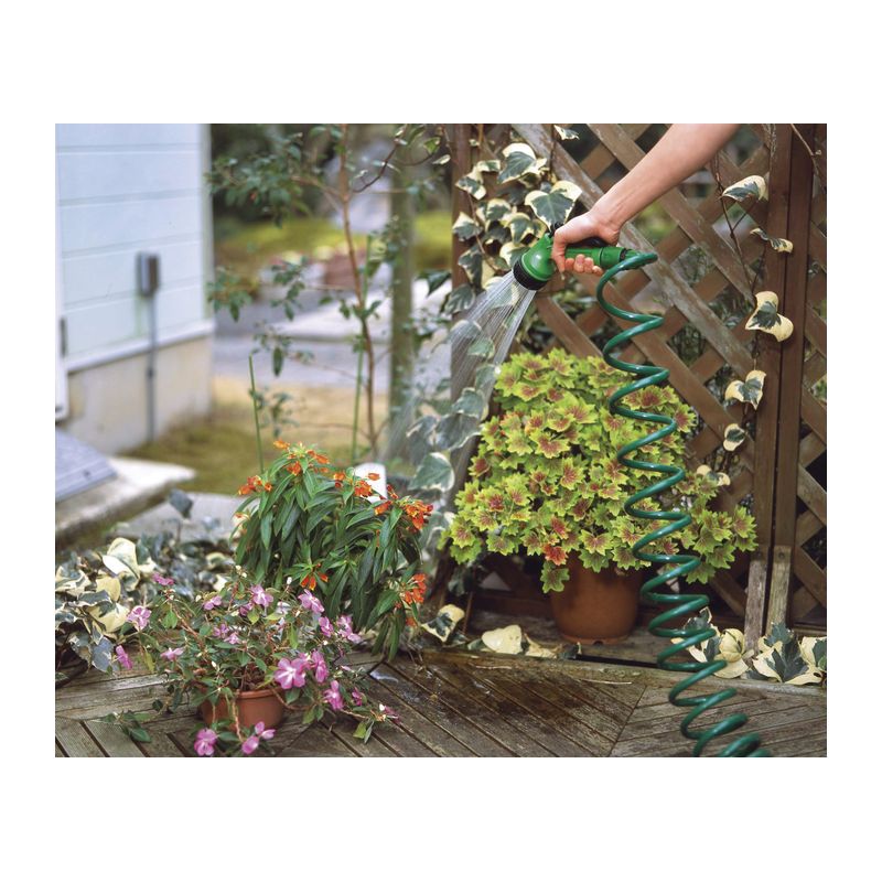 巻取り不要!専用スタンド付でラクラク収納!・有効使用範囲12m・口径16mmの丸型蛇口にご使用いただけます。 ・ノズルの噴射は7種類! シャワー・ミスト・アングル・ジェット・ フル・フラット・バーティカル
