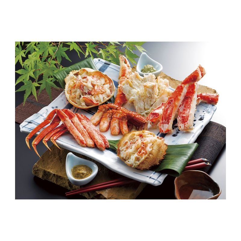 3種類の蟹を詰め合わせました。「ずわいがに」はプリプリの身と甘い蟹みそを、「毛がに」は濃厚なミソと身を、「たらばがに」は食べ応え十分な太い脚を存分に味わってください。蟹好きにはたまらない一品です。